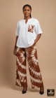 This stylish two-piece set combines simplicity and elegance. The outfit features a crisp white top with a flattering V-neckline and short sleeves, complemented by a chest pocket made from matching tie-dye Kampala fabric. The wide-leg palazzo pants, designed with a brown and cream pattern, add a touch of cultural flair and comfort. Perfect for casual outings, office wear,weddings, or weekend brunches, this outfit blends modern style with African sophistication.