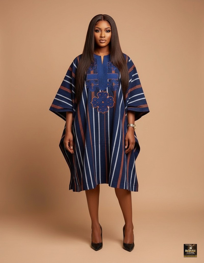 A modern, free-flowing Kaftan-style midi dress. The fabric features rich vertical stripes in Navy Blue, White, and Rust Orange, reminiscent of traditional hand-woven cloths. The chest is embellished with a solid navy yoke and intricate, contrast-colored embroidery, giving it a high-fashion, yet relaxed, cultural aesthetic. Perfect for Trendy casual wear, high-end resort wear. Material: Handwoven aso-oke Color: Multicolor