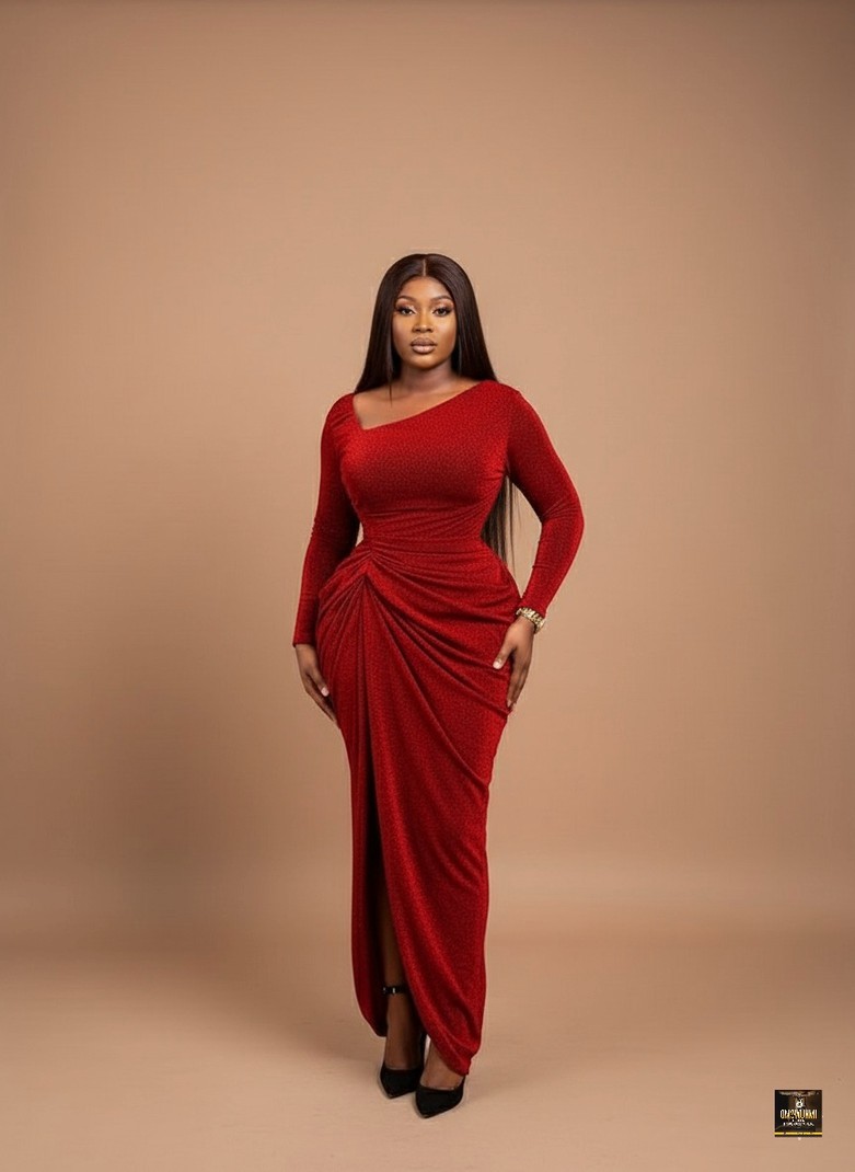 Command attention at your next formal event in our sensational Shimmering Ruched Red Gown, a design masterpiece crafted for unforgettable glamour. This stunning, floor-length dress is sculpted from a luxurious, stretchy fabric imbued with a subtle, all-over shimmer, ensuring you sparkle elegantly under the lights. The gown features an alluring asymmetrical wide neckline and sleek, fitted long sleeves, balancing the dramatic ruching that beautifully cinches the bodice and highlights the hourglass figure. This sophisticated drapery sweeps down the side, creating a high-impact, cascading skirt detail and a subtle front slit, making this body-contouring piece the perfect choice for a black-tie gala, wedding reception, or any occasion demanding true red-carpet elegance.