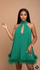 This playful and glamorous mini-dress is designed to make a captivating statement, featuring a vibrant, solid emerald green fabric with a dramatic and flirtatious silhouette. The garment is cut in a voluminous, relaxed babydoll or trapeze style that flares dramatically from the high neckline, creating beautiful movement and an airy, comfortable fit that ends at the mini-length hemline. The design is elegantly structured with a high halter neckline that gathers at the collar, transitioning into a keyhole cut-out at the décolletage for a touch of alluring detail. The entire short hem is lavishly trimmed with a lush band of soft, matching emerald green feathers, adding a fun, textural element and a sophisticated finish, making this the perfect piece for cocktail parties or festive evening events.