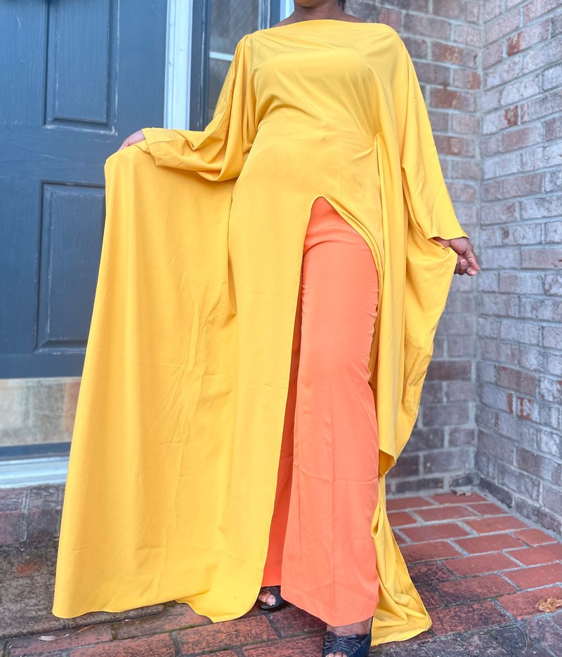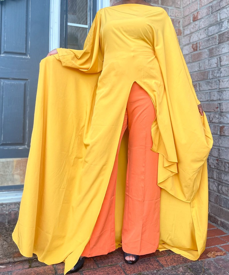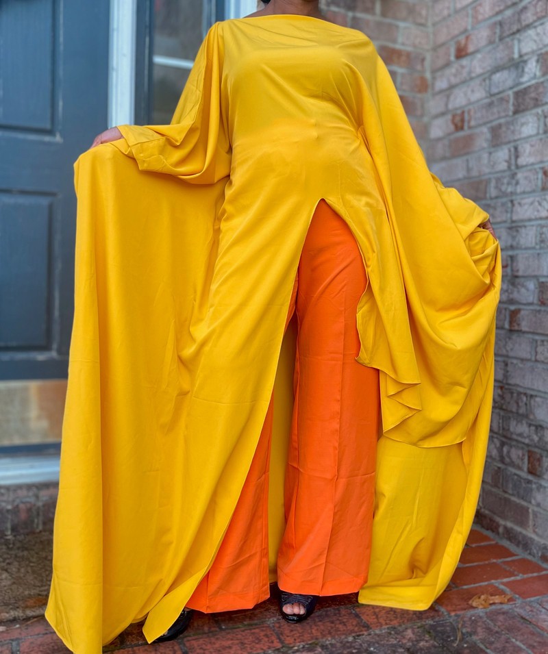 Yellow and Orange Flowy oversized asymmetrical cape top and pants set