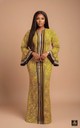 Radiate confidence in this stunning floor-length maxi dress. Crafted from a vibrant yellow speckled ankara fabric, this gown is designed to elongate and flatter the figure. The centerpiece of the design is a bold, vertical tri-color handwoven aso-oke(brown, white, and gray) that runs from the V-neckline down to the hem, creating a slimming, statuesque effect. The look is completed with dramatic trumpet sleeves featuring matching handwovenaso-oke. Why We Love It: It offers a "tall and slim" visual effect while remaining incredibly comfortable. Ideal For: Sunday service, formal luncheons, or cultural weddings. Material: Ankara & handwoven aso-oke Color: Multicolor
