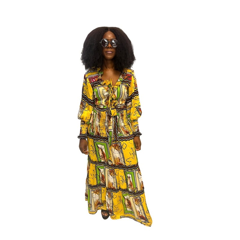 Yellow Chiffon Fit and Flared Maxi Dress Perfect for a casual or dressy affair Its Elegant, Sexy and it's a showstopper Fabric: Silk and Cotton Fabric care: Dry Clean Or Handwash only Produced in a pest, smoke & dust free environment. Please note that measurements in the size guide are general and a custom order can be made by sending the following measurements: • Bust (Around the bust under the arm. Should be comfortably free) • Waist • Shoulder (from one shoulder bone across your nape to the other shoulder bone) • Hips (Around the widest part of your hip) • Length (From your shoulder as long as preferred)