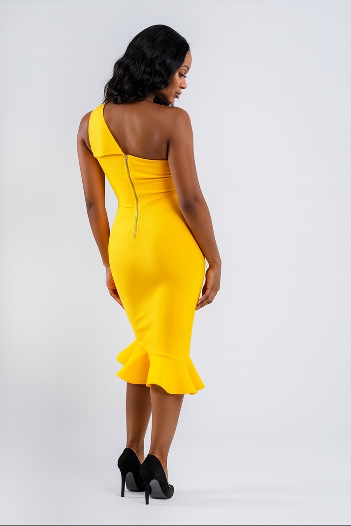 Step into elegance with this stunning Yellow One-Shoulder Bandage Dress, designed for women who love to stand out with sophistication. With its curve-hugging fit and ruffled hem, this piece is both modern and timeless, making it perfect for cocktail parties, weddings, evening events, or even a chic daytime look. • Versatile Style: Whether you're dressing up for a special occasion, a night out, or a classy brunch, this dress is your go-to. Its striking cut and vibrant color ensure all eyes are on you. • Premium Comfort: Crafted from high-quality bandage fabric, it combines elegance with comfort. The stretch material sculpts your silhouette while allowing you to move with ease. • Flattering Fit: The adjustable bandage design cinches at the waist, enhancing your natural curves for a feminine, figure-flattering look. • Durable Construction: Made to last, this dress resists wear and keeps its shape, even after multiple uses. A smart investment piece for your wardrobe. • Designed for Women: Tailored to celebrate the female form, this dress strikes the balance between elegance and confidence.