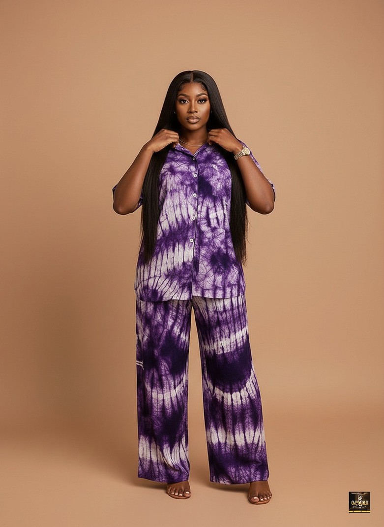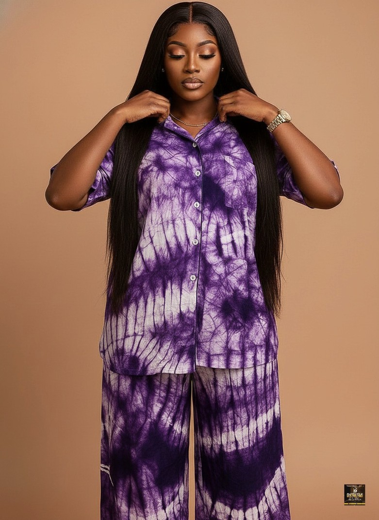 This stylish two-piece set is a vibrant and comfortable ensemble, crafted from a lightweight fabric featuring an eye-catching, handcrafted tie-dye/ batik pattern dominated by rich shades of deep purple and stark white. The matching set includes a relaxed, button-up shirt designed with a classic collar and comfortable short sleeves, mirroring the overall abstract, streaked pattern across its entirety. Complementing the top are high-waisted, wide-leg trousers that flow gracefully to the floor, ensuring a relaxed yet fashionable silhouette, perfectly matching the artistic, organic design of the shirt. This coordinated outfit, with its blend of bold color and laid-back structure, offers a unique blend of comfort and style, making it ideal for chic lounge wear, travel, or bohemian-inspired daytime outings.