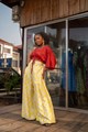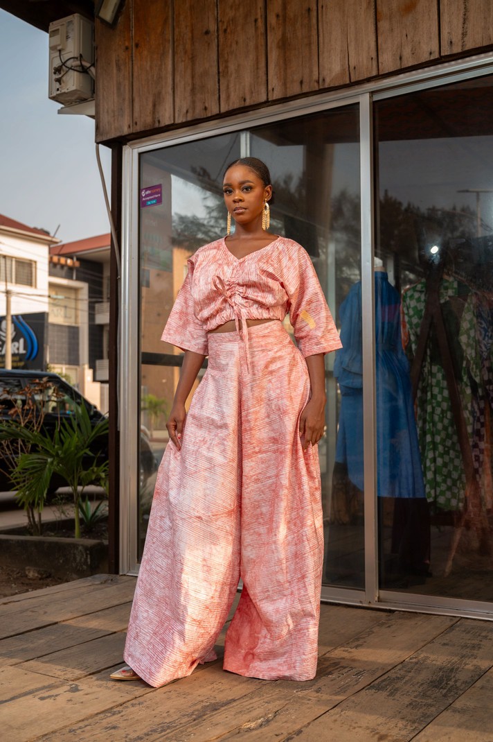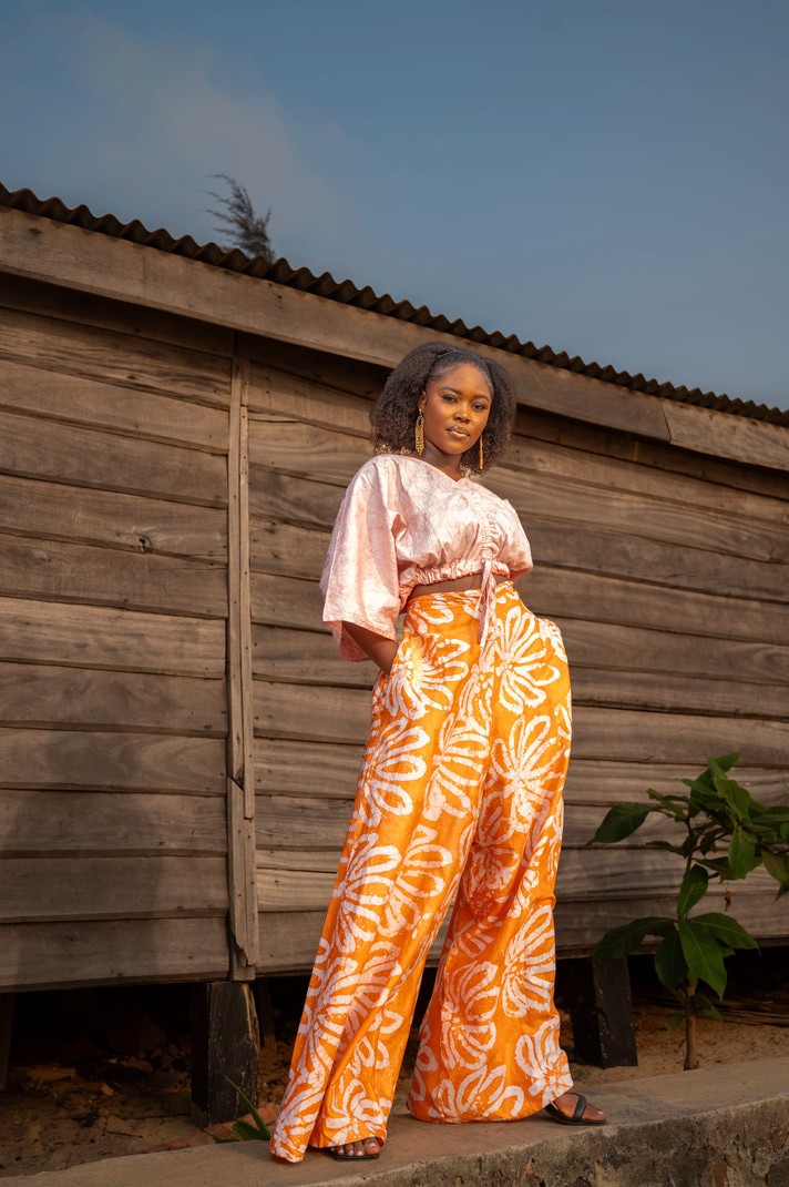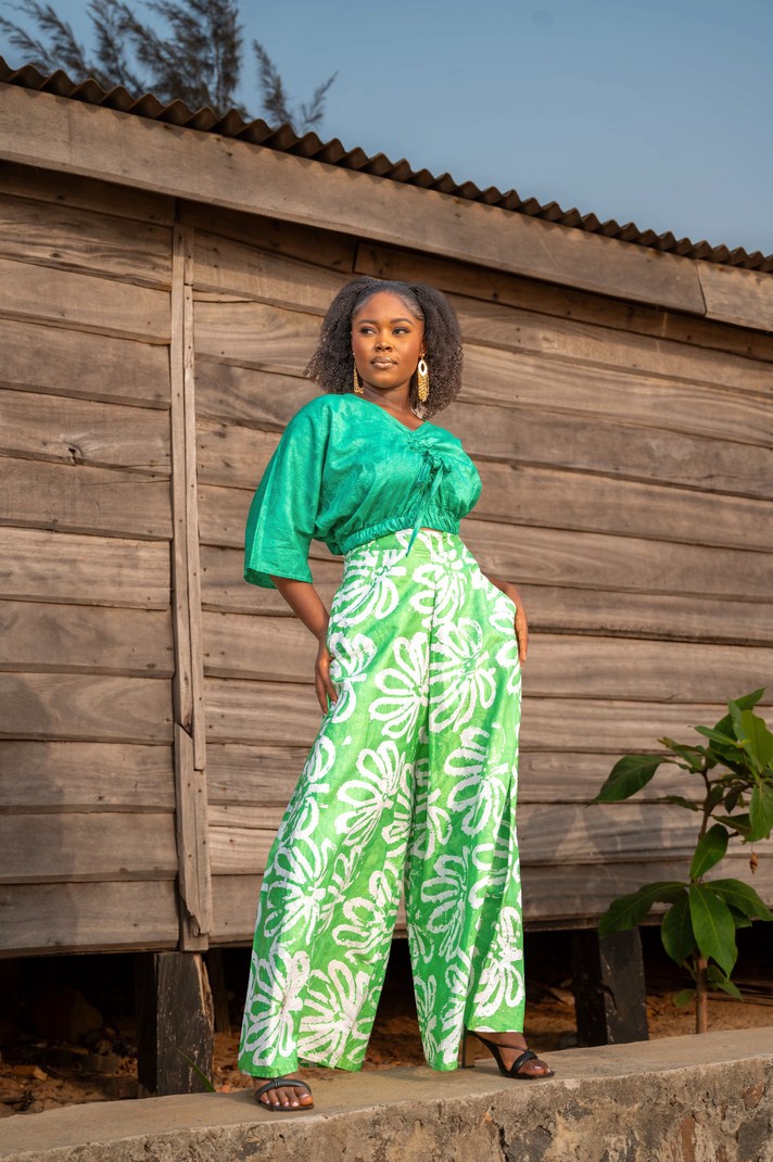 This Pants suit is suitable for the classic woman. The piece is light weight with movement, 100% batik cotton. The process to design this piece takes about 3 days- Firstly the cotton is design with batik patterns; then hand dyed to beautiful colors; and finally hand-tailored to this finished product by our artisans and tailors in the North of Sierra Leone.