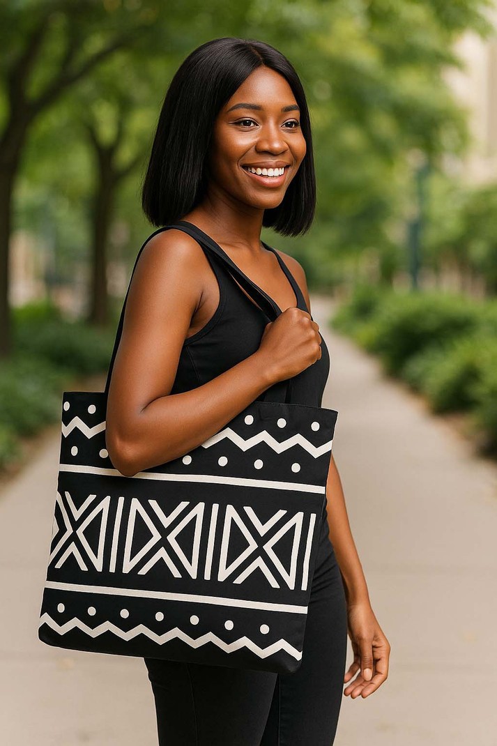 This bold Zigzag Black & White Tote Bag combines African prints and ethnic bohemian fashion. With a large capacity, it is perfect for adventurous souls who value style and functionality. Stand out from the crowd and take risks with this unique tote bag! Product Description • 510 g/m2. Made from high-grade canvas. • Durable and roomy enough for your daily items. • Lightweight canvas tote bag with sturdy handle is easy to carry. • Perfect for shopping and carrying your essentials. Delivery Time This item will be processed within 3-7 business days (Excluding Weekends and Holidays). Once products ships it can take up to 15 Business days depending on your location. Out of Stock items can be requested by emailing us at [email protected] Care Instructions Machine wash cold inside out. Gentle cycle with mild detergent and like colors. Do not use bleach or fabric softener. Do not tumble dry. Hang to dry to ensure maximum shelf life. Iron inside out if necessary. Do not iron the print. Do not dry clean.